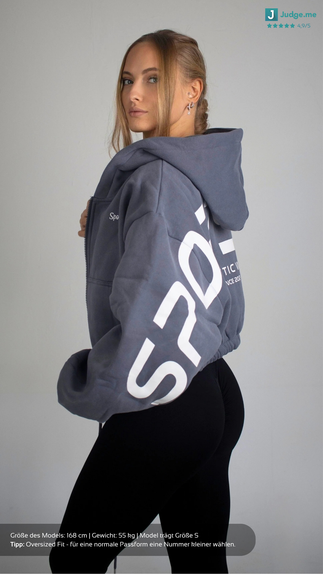 Unsere Oversized Zipper vereinen Komfort, Stil und Funktionalität. Hergestellt aus Baumwolle bieten sie ein angenehmes Tragegefühl und optimale Atmungsaktivität. Das markante "Sportsbabe" Aufdruck auf der Rückseite verleiht dem Look eine extra Portion Coolness. Mit einem Schnürzug am Bund kann die Passform individuell angepasst werden. Diese Jacke ist nicht nur super stylish, sondern auch aus hochwertigem Material gefertigt, das Langlebigkeit und Tragekomfort garantiert. Ideal für den Sport oder als lässiges Statement-Piece im Alltag.