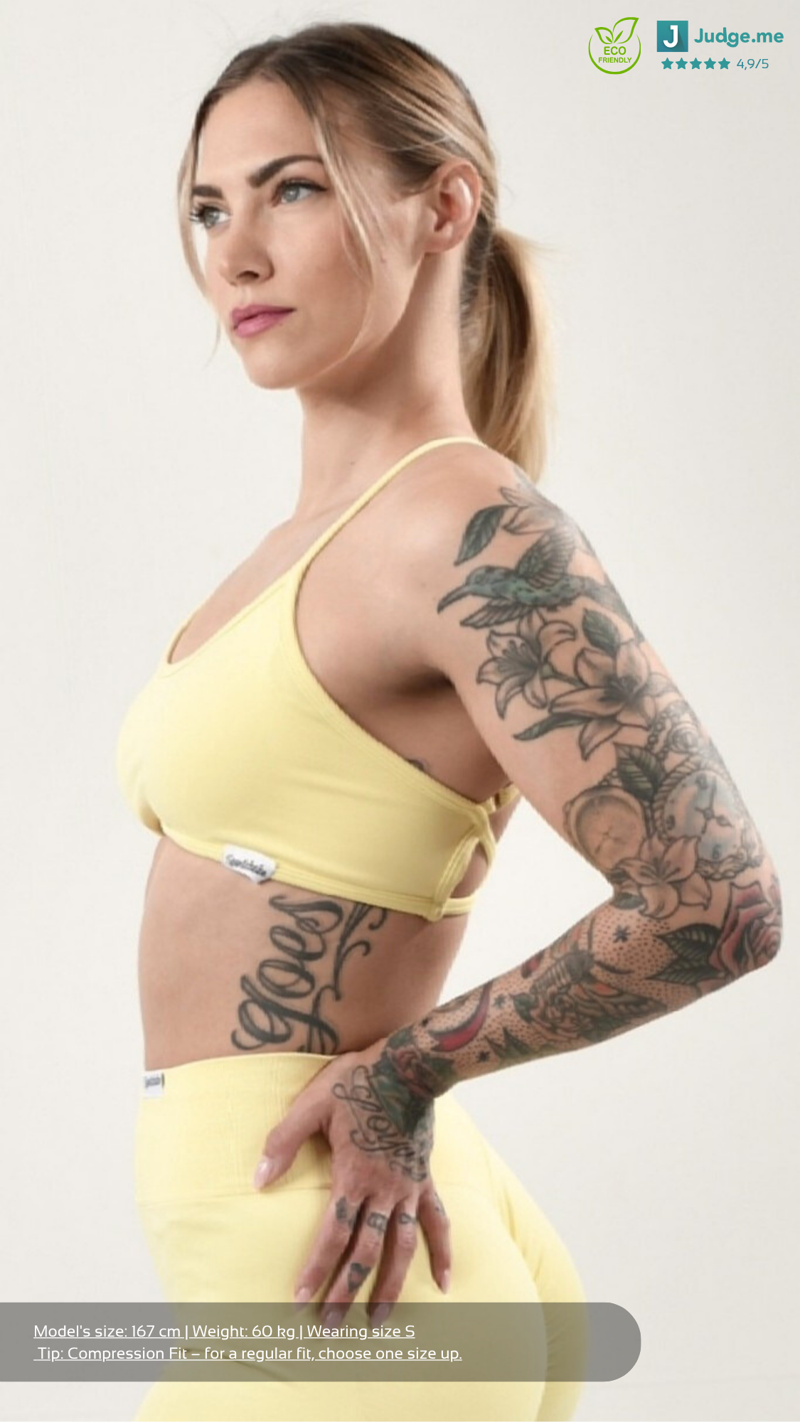 Sommergefühl auf der Haut – mit unserem Vibrance Sports Bra. Designt für Bewegung, gemacht zum Wohlfühlen. Der rückenfreie Schnitt, die verstellbaren Träger und die formgebenden Seamless-Details zaubern dir nicht nur eine wunderschöne Figur, sondern schenken dir volle Bewegungsfreiheit. Die sommerlichen Farben Blush Pink, Butter Yellow und Sky Blue machen jeden Look zum Eyecatcher – egal ob beim Training, auf Reisen oder in deiner Freizeit.