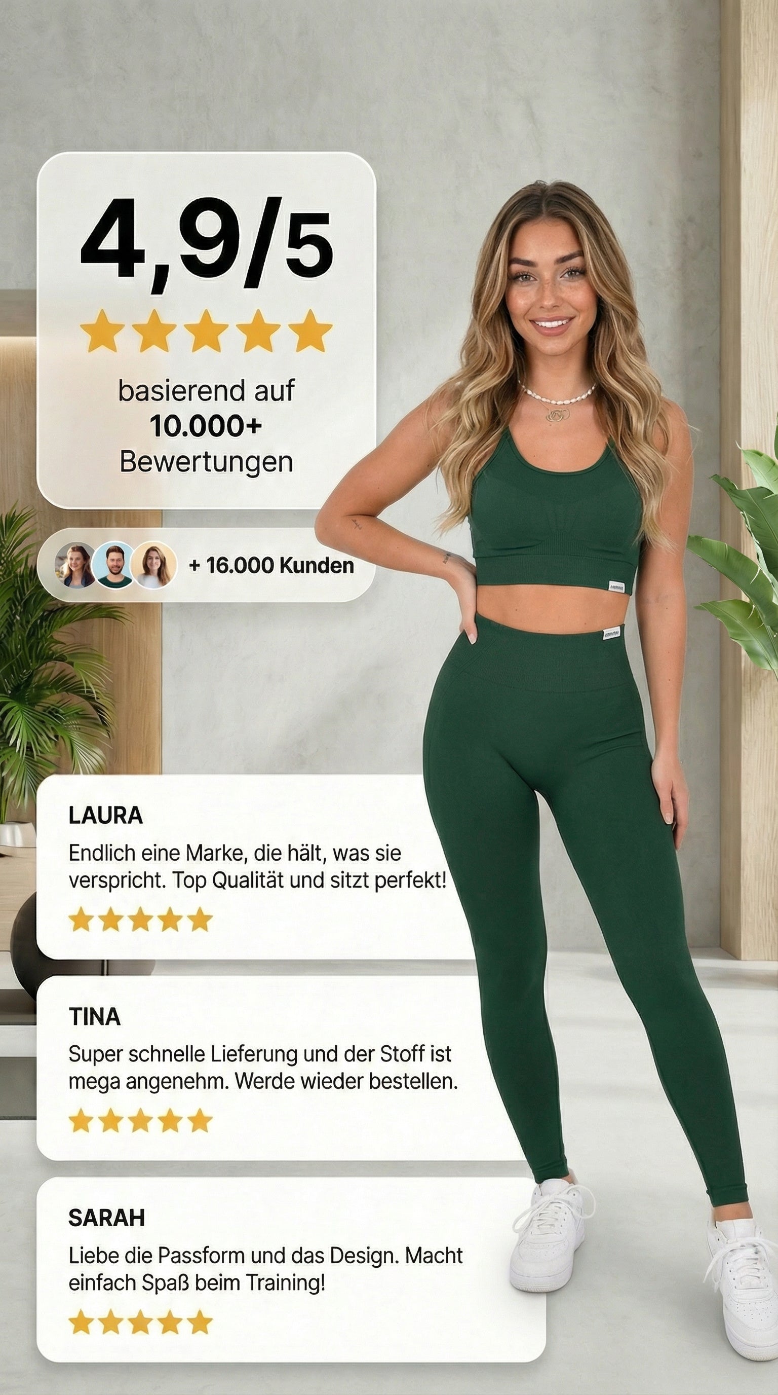 Der Sport BH + Hose passt und sitzt perfekt. Das Tragegefühl ist super angenehm und der überkreuzte Rücken mach Optisch einfach was her! Ich freue mich schon auf meine nächste Bestellung in weiteren tollen Farben!