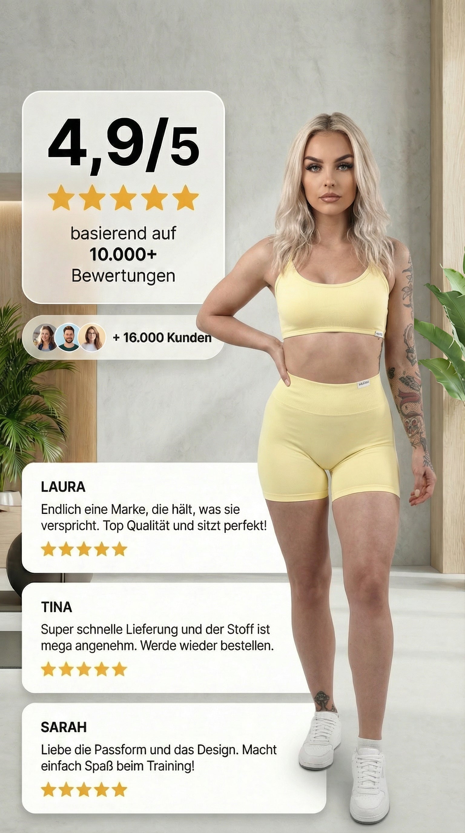 Der Sport BH + Hose passt und sitzt perfekt. Das Tragegefühl ist super angenehm und der überkreuzte Rücken mach Optisch einfach was her! Ich freue mich schon auf meine nächste Bestellung in weiteren tollen Farben!