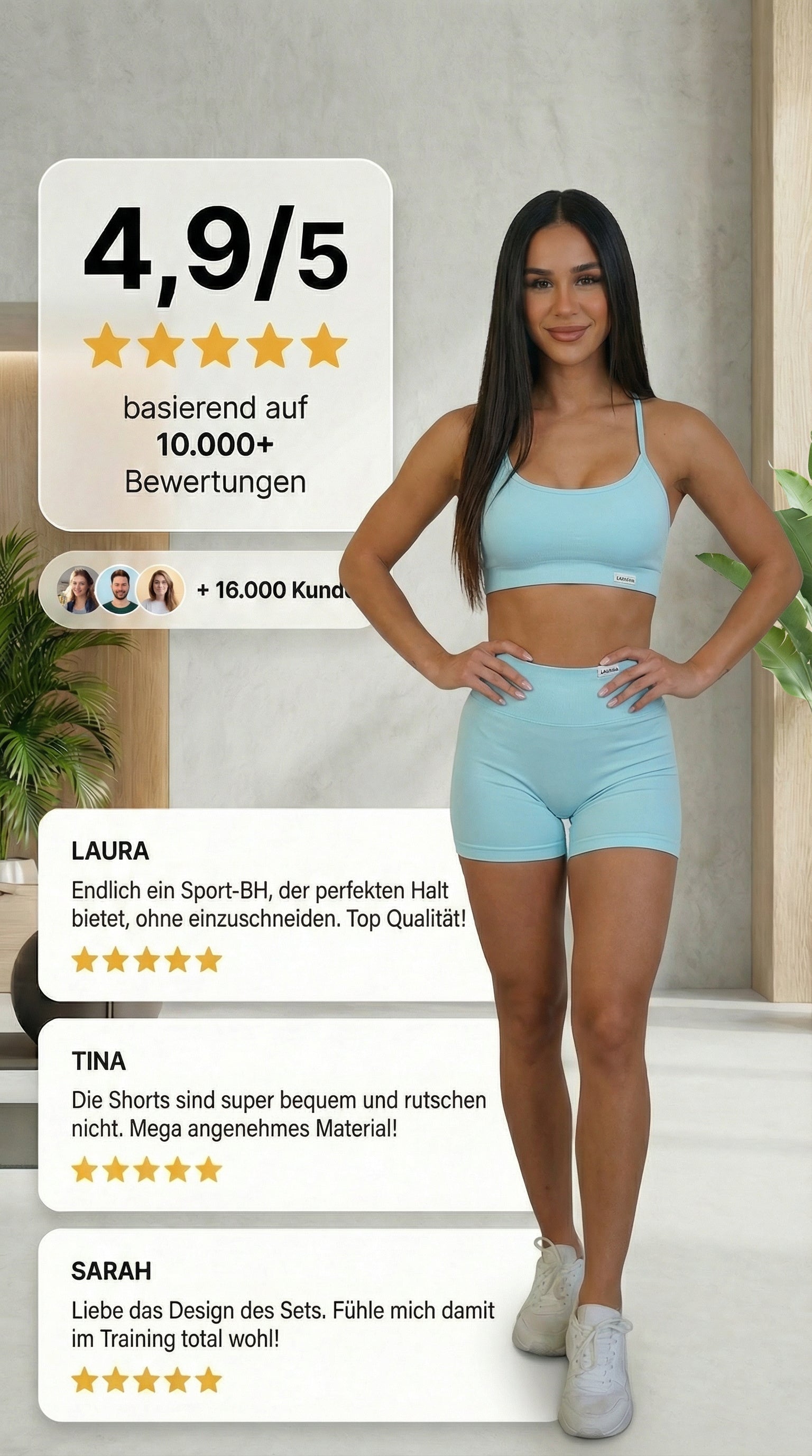 Der Sport BH + Hose passt und sitzt perfekt. Das Tragegefühl ist super angenehm und der überkreuzte Rücken mach Optisch einfach was her! Ich freue mich schon auf meine nächste Bestellung in weiteren tollen Farben!