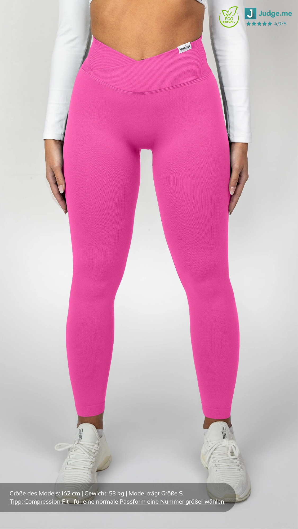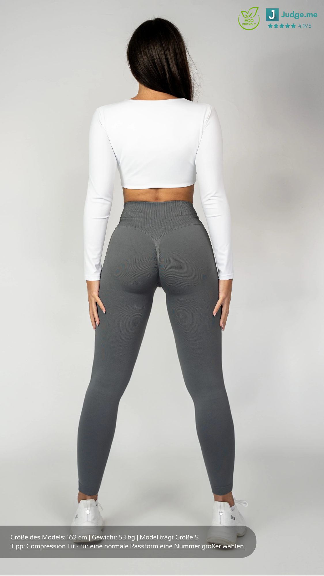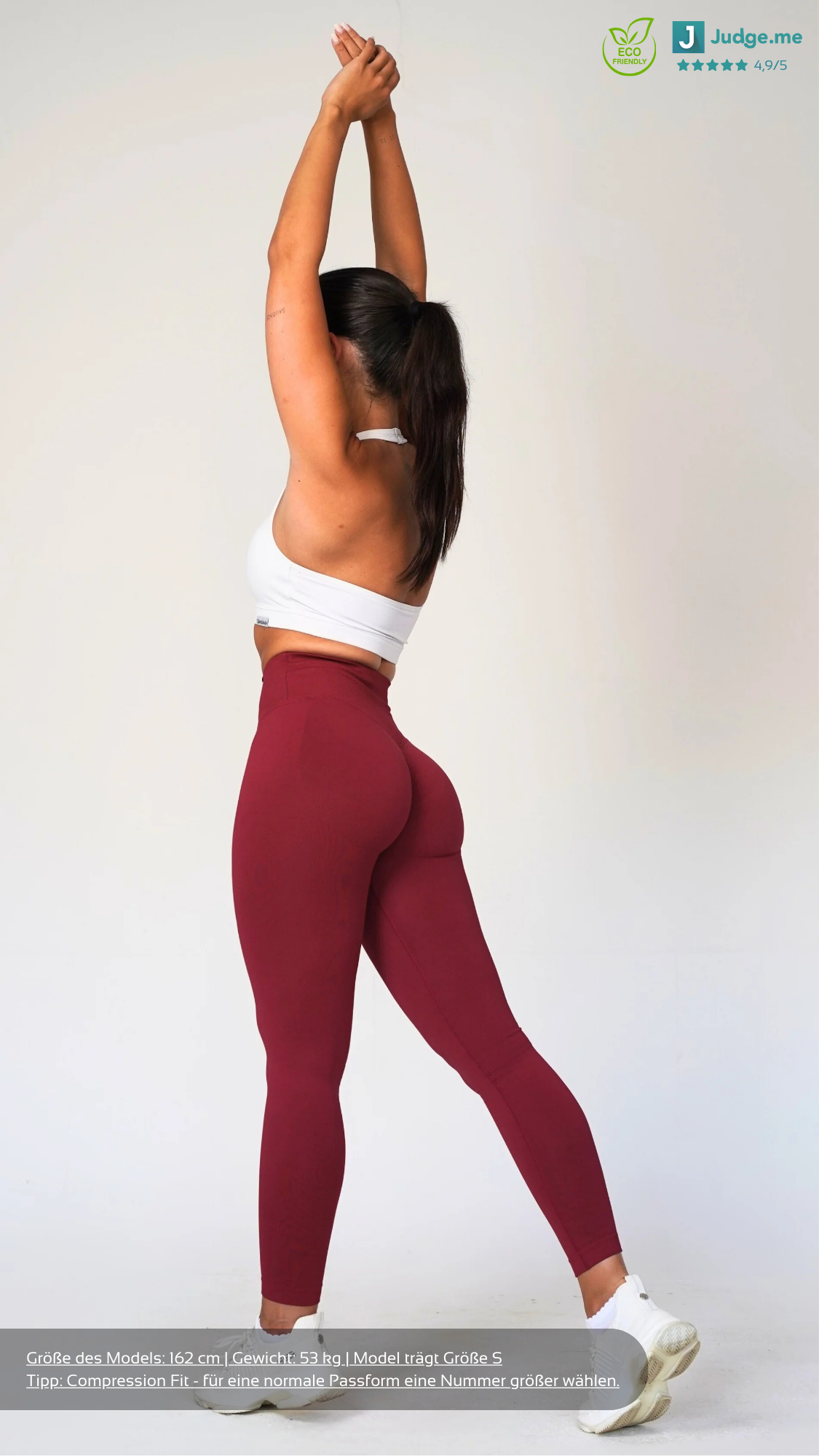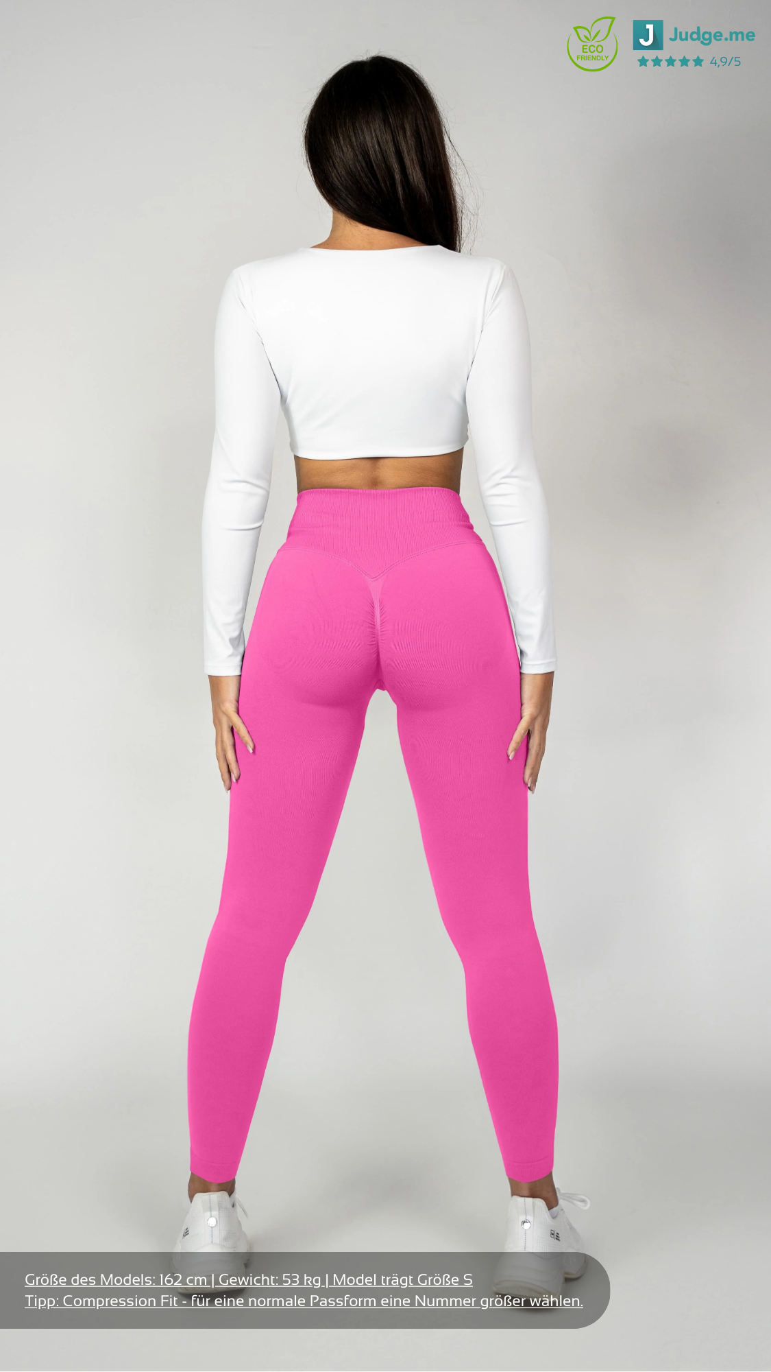 Die V-Shape Leggings besteht aus recycelten Materialien und ist 100% blickdicht und squatproof. Das besondere und einzigartige an den Shorts ist, dass der V-Shape-Bund deine Hüfte besonders definiert sowie deine Taille schmaller wirken lässt. Demzufolge werden deine Kurven optimal betont. Zusätzlich dazu besitzt die Leggings einen Scrunch am hinteren Teil der Leggings, welches deine Kurven den letzten Feinschliff verpasst. Solch eine Leggings, die den V-Shape Bund mit einer Scrunch Naht kombiniert, gab es noch nie! Außerdem ist die Leggings dank des Seamless Materials sehr dehnbar und bequem. Das sportliche und zugleich elegante Design ermöglicht dir ebenfalls, unsere Leggings in der Freizeit oder an einem Rest-Day zu tragen.