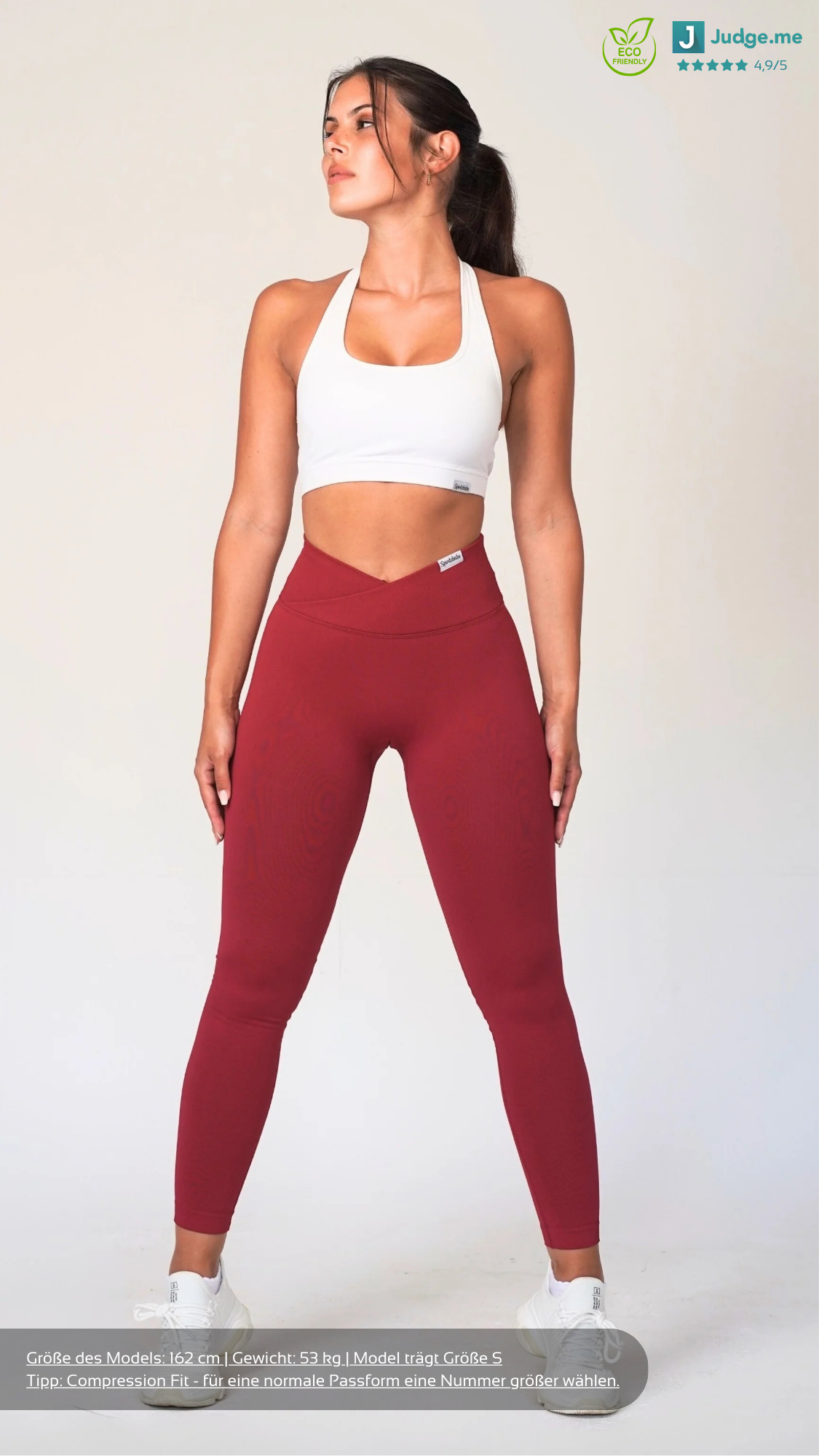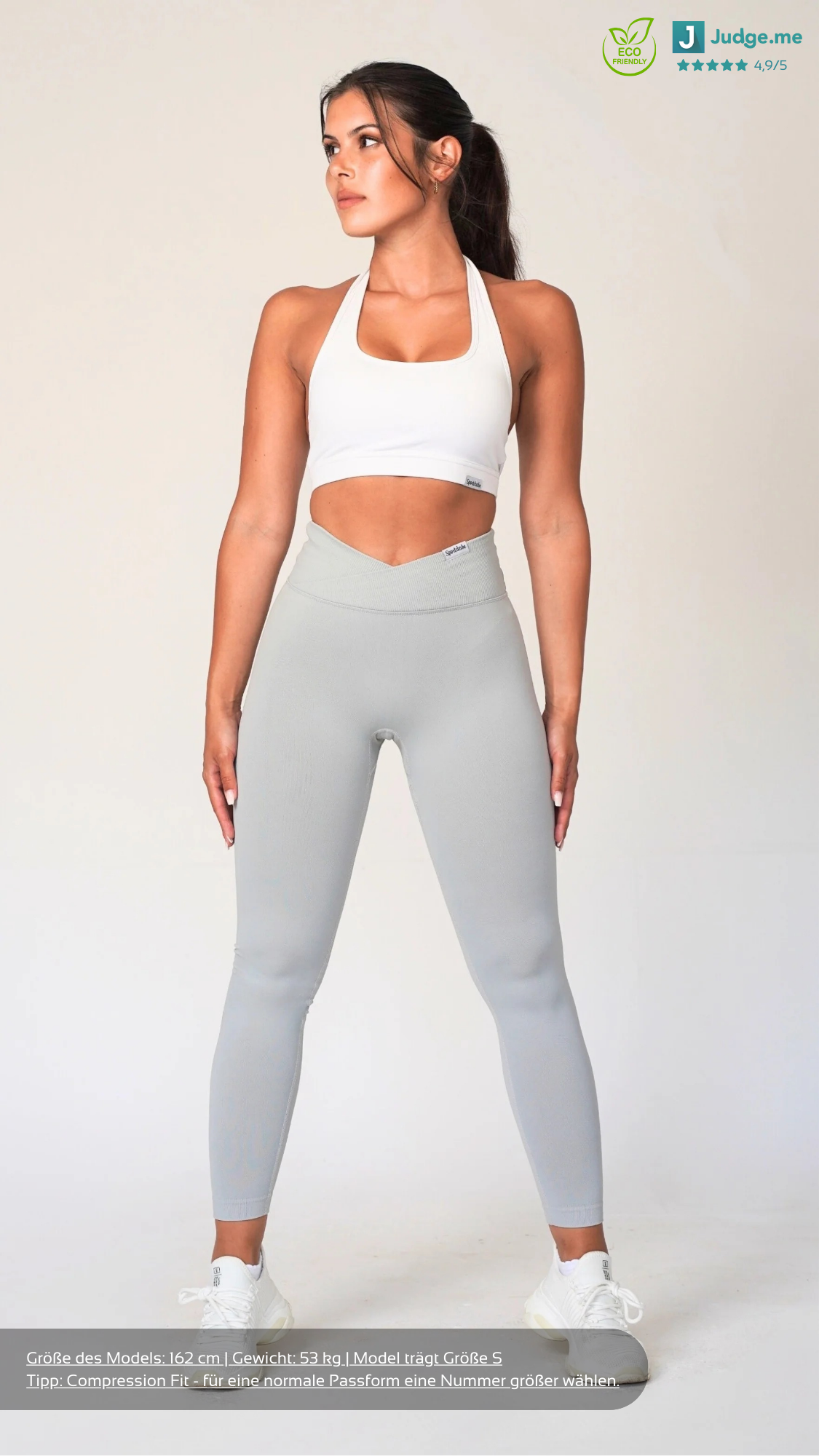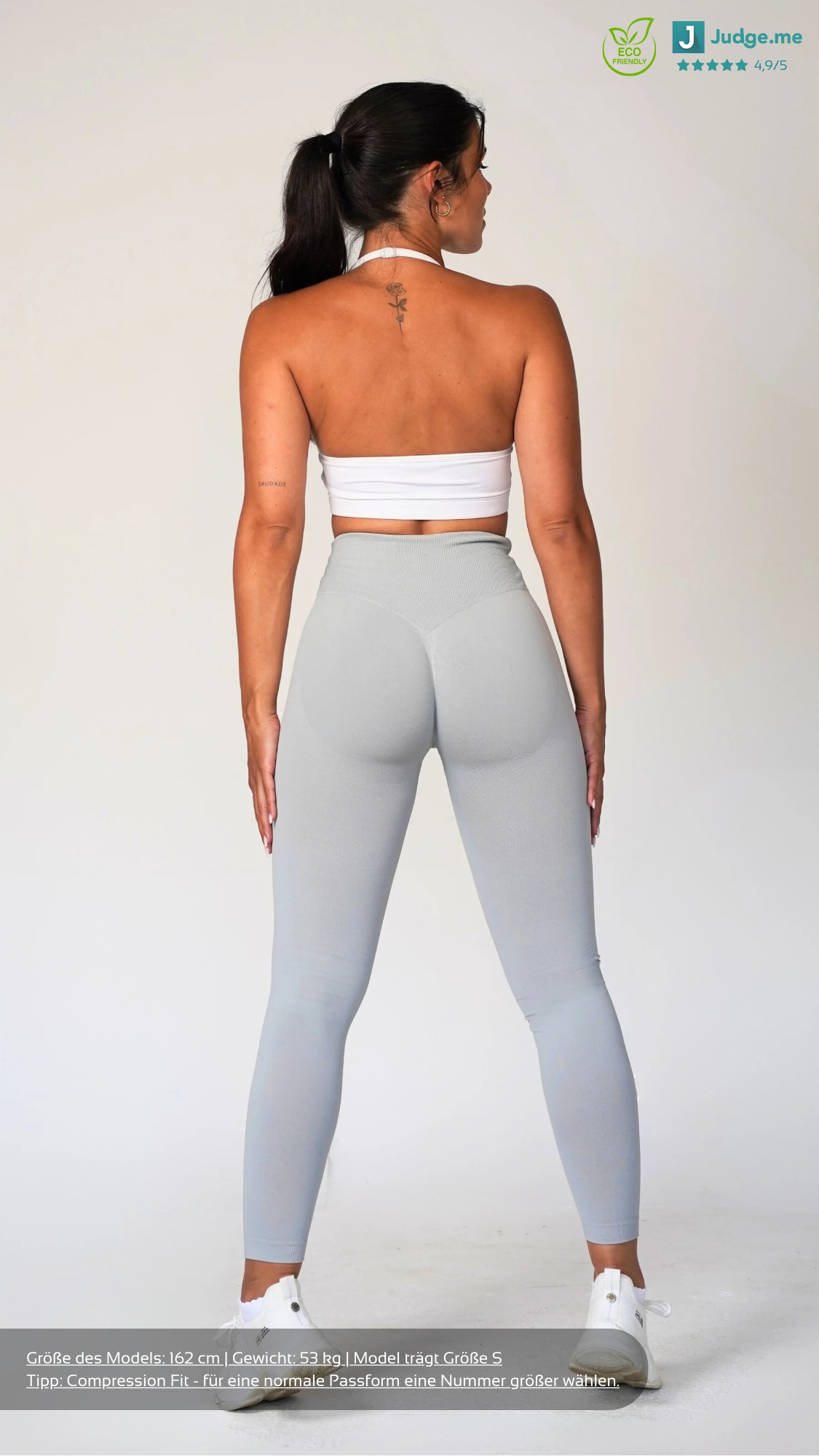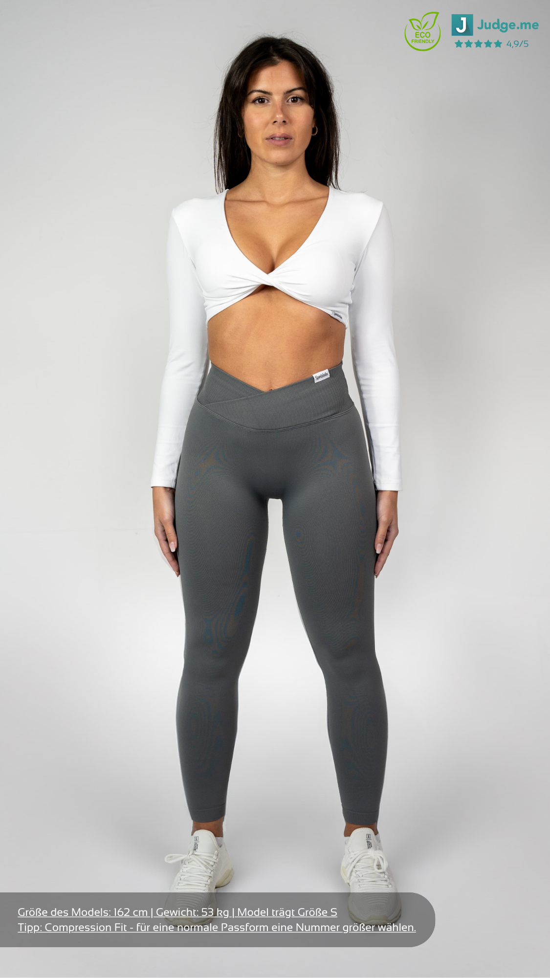 Die V-Shape Leggings besteht aus recycelten Materialien und ist 100% blickdicht und squatproof. Das besondere und einzigartige an den Shorts ist, dass der V-Shape-Bund deine Hüfte besonders definiert sowie deine Taille schmaller wirken lässt. Demzufolge werden deine Kurven optimal betont. Zusätzlich dazu besitzt die Leggings einen Scrunch am hinteren Teil der Leggings, welches deine Kurven den letzten Feinschliff verpasst. Solch eine Leggings, die den V-Shape Bund mit einer Scrunch Naht kombiniert, gab es noch nie! Außerdem ist die Leggings dank des Seamless Materials sehr dehnbar und bequem. Das sportliche und zugleich elegante Design ermöglicht dir ebenfalls, unsere Leggings in der Freizeit oder an einem Rest-Day zu tragen.