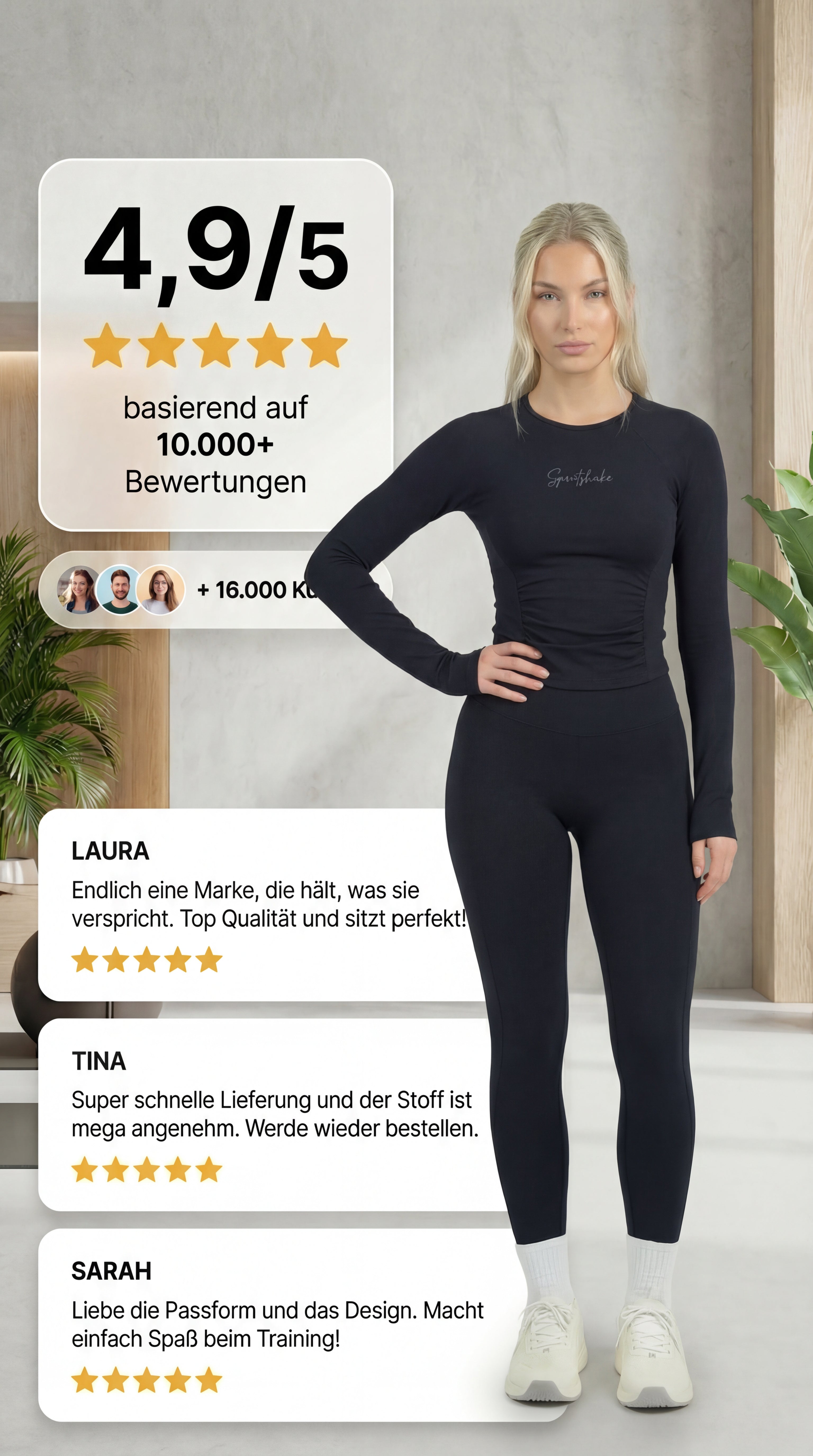 Der Sport BH + Hose passt und sitzt perfekt. Das Tragegefühl ist super angenehm und der überkreuzte Rücken mach Optisch einfach was her! Ich freue mich schon auf meine nächste Bestellung in weiteren tollen Farben!