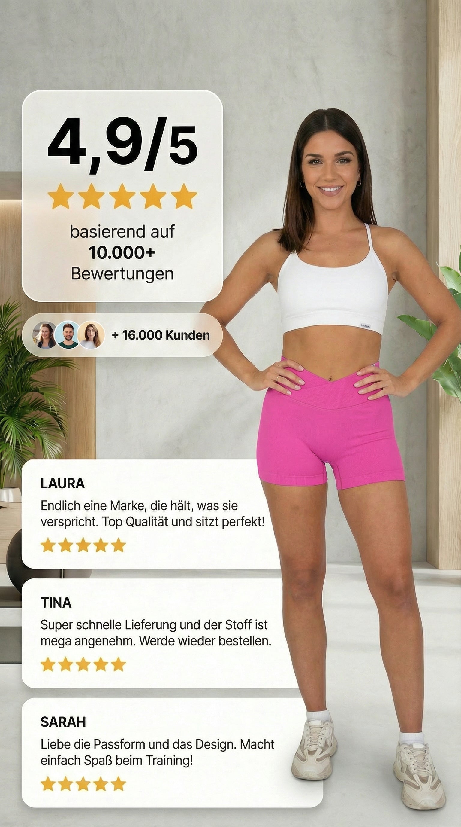 Die V-Shape Short ist dein neues Must-Have! Diese besteht aus recycelten Materialien und ist 100% blickdicht und squatproof. Das besondere an den Shorts ist, dass der V-Shape-Bund deine Hüfte besonders definiert sowie deine Taille schmaller wirken lässt. Demzufolge werden deine Kurven optimal betont. Zusätzlich dazu wird der Scrunch am hinteren Teil der Leggings deine Kurven den letzten Feinschliff verpassen. Der formgebende Bund mit V-Shape sorgt für eine Sanduhr-Silhouette und das super weiche und elastische Material passt sich jeder Körperform an. Außerdem ist die Short dank des Seamless Materials sehr dehnbar und bequem. Das sportliche und zugleich elegante Design ermöglicht dir ebenfalls, unsere Short in der Freizeit oder an einem Rest-Day zu tragen.